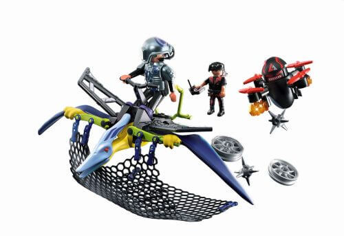 Even at lofty heights, the vicious robotic machines are on the move. A drone makes the airspace unsafe. But that's no problem for Kaidan and his agile Pteranodon. The pterosaur is at home in the sky. With its projectile net, it can knock out approaching enemies in a flash. Of course, his good friend Kaidan is always with him on his back. There's no stopping this clever human-flying dinosaur duo. Attack from the air - repelled!