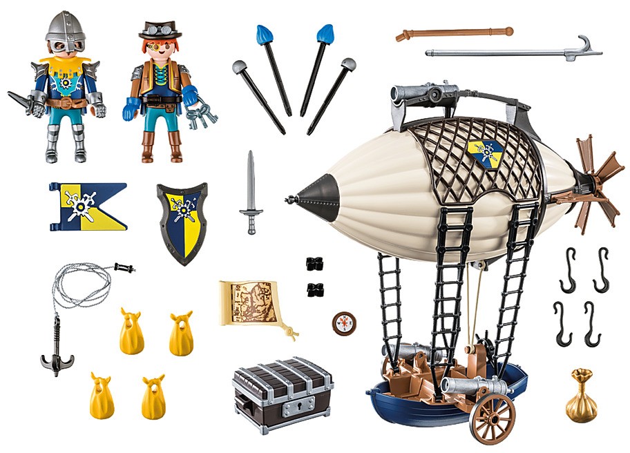 - Set includes Dario Da Vanci and Bruce Benett from the kingdom of Novelmore, airship, three functioning cannons, map, compass, treasure chest, grappling hook, Novelmore flags, and many more accessories.