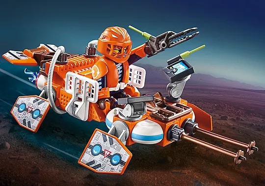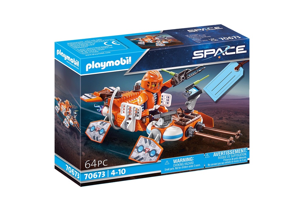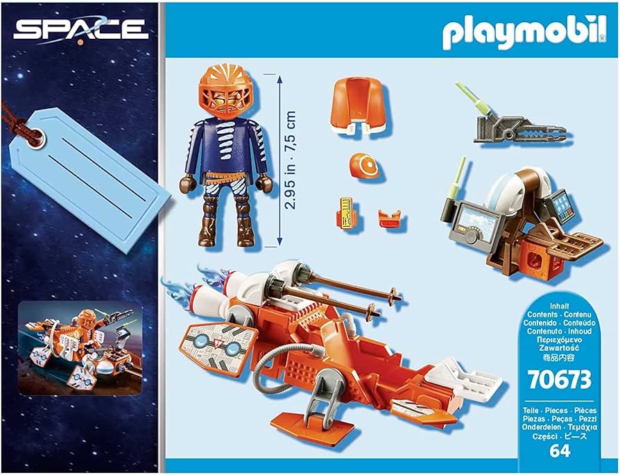 Join the astronaut on his way through the vastness of space with his cool Space Speeder. To explore the planets surface, the pilot climbs into his speeder, folds up the shields and takes off. If something should break, he has his big pliers with him. Off to the next adventure! The great PLAYMOBIL gift sets in decorative boxes can be individually labelled with names and save on wrapping paper.