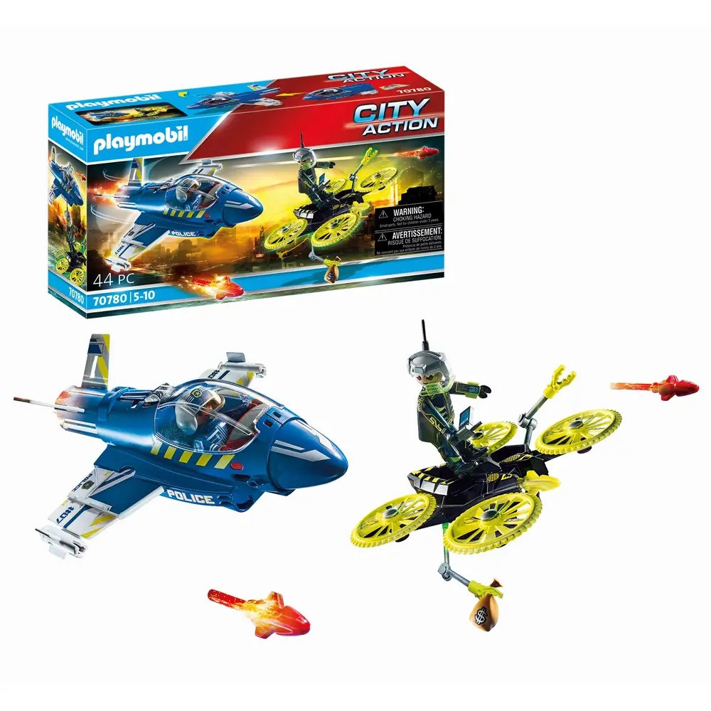 - For exciting chases in the air! The police jet pursues the money robber fleeing with an innovative drone.