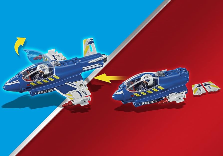 A clever villain has built himself a super drone and is now making the city unsafe. But the culprit hasn't reckoned with the PLAYMOBIL police and their cool jet. In no time at all, the pilot jumps into the cockpit and unfolds the nose, fuselage and wings of the plane. The projectiles are attached to the underside of the wings and off they go into the air. But what is this? No sooner has the jet left the ground than a projectile shoots a hair's breadth past the cockpit. The pilot manages to dodge it at the last moment. But the crook is already approaching again and the sharp saw teeth on the rotor blades of the drone miss the jet by only a few centimetres. An exciting chase in the air begins. The playset contains two PLAYMOBIL figures, a fold-out police jet with firing cannons, a drone with moving rotor blades and gun, helmets, arm computers and many other extras.