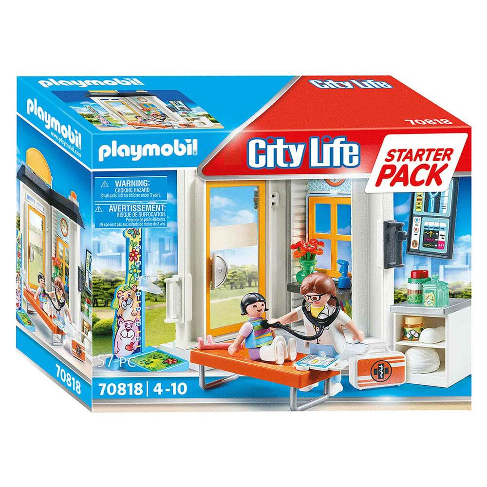Welcome to the friendly PLAYMOBIL pediatrician's office. Here little patients are lovingly cared for. A girl had an accident on the street. The helpful pediatrician examines the child carefully on the examination couch and gently listens to the chest with the stethoscope. She then bandages the head wound and applies a cast to the broken arm. Everything will heal again, but for now a few days of rest is called for. PLAYMOBIL Starter Packs are an ideal introduction to the big colourful PLAYMOBIL world. The sets include the part of a building, two figures and great extras, are quickly assembled and ready to play immediately. Thanks to the age-appropriate accessories, Starter Packs are ideal for children aged four and up. With plaster labels for individual sticking.