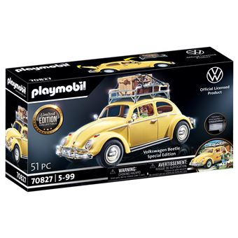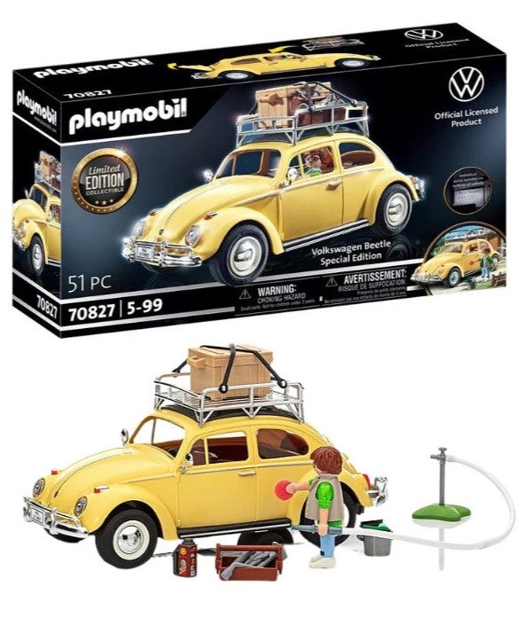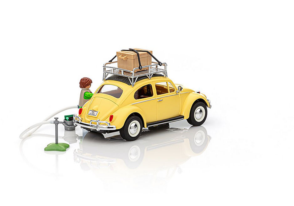 Who doesn't know the unique Volkswagen Beetle? Now the legendary family car appears in a new yellow colour variant in a limited special edition. Like the great original, the PLAYMOBIL Beetle of course has the typical curved fenders, round rear view mirrors in chrome look and a 4-cylinder boxer engine under the rear hood. On the roof there is a roof rack with straps to secure the luggage. A bucket, sponge and water hose are provided for perfect car care. This Beetle model is simply to fall in love with! The playset includes a PLAYMOBIL figure, a Volkswagen Beetle with roof rack, crate, water hose, sponge, bucket and many other extras for Beetle fans. The car has room for four figures.