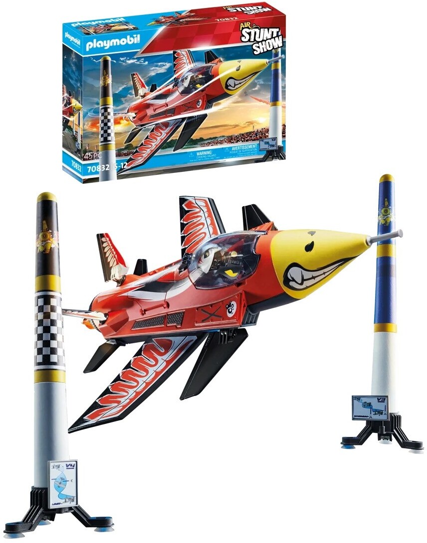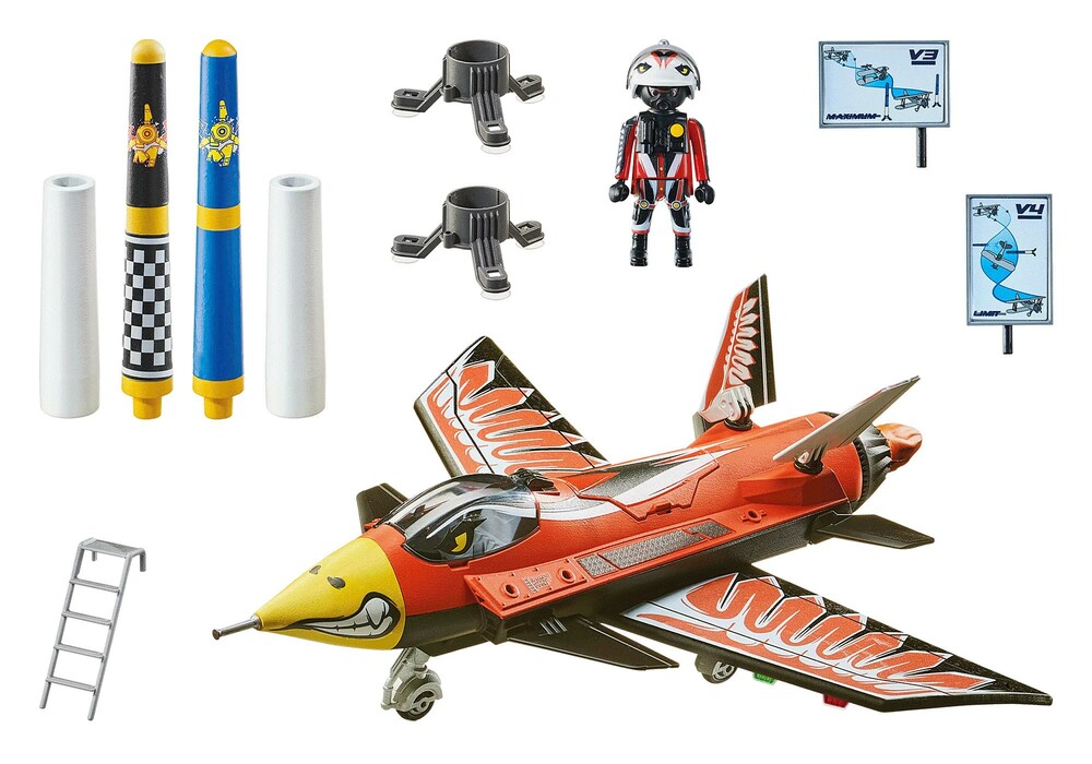 The jet pilot can easily climb into the cockpit with the ladder and adjust the foldable wings. With the three suction cups on the stand, the large pylon can be placed easily on smooth surfaces, marking out an aerial course for the plane.