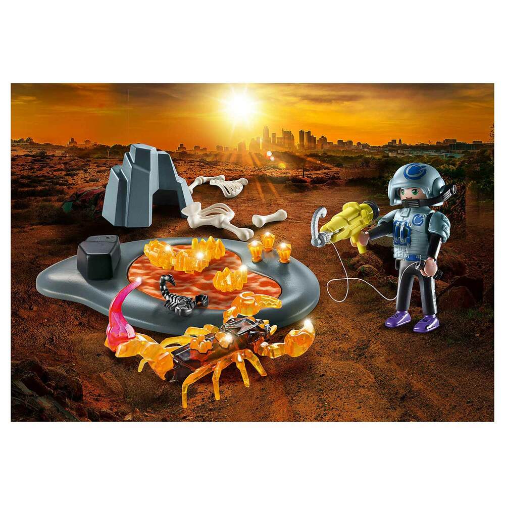 Team Dino Rise always has its hands full thwarting the cunning actions of the Comet Corporation. This time Ian has to deal with a huge fire scorpion. In addition to the arachnid's gigantic claw arms, Ian also has to watch out for his dangerous pointy tail. But the chosen one already has an idea: he skillfully shoots a grappling hook at the crystal on the scorpion's back and pulls the gem towards him. This way he can catch the crystal without being stung. What a clever maneuver! PLAYMOBIL Starter Packs are ideal as a start or addition to the many colorful PLAYMOBIL game worlds. The set includes Team Dino Rise member Ian, a fire scorpion, four little scorpions, helmet, shoulder straps, stones, six fire crystals and many other extras for exciting dino adventures.