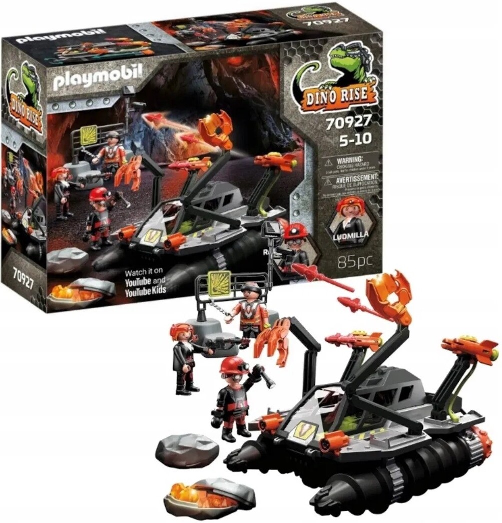 In the Dino Mine, also the treacherous team of the Comet Corporation must adjust to a new situation. Using their Demolition Drill, Ludmilla and Ralph make their way through the tunnels of the Dino Mine in search of the lava source. When the Demolition Drill is in motion, the crawler drive and the lateral drill heads move. The harvested boulders can be picked up and opened with the drill's gripper arms. Each rock contains an energy stone, these are stored in the tray under the canopy. Should Team Dino Rise approach, Ludmilla and Ralph will defend themselves with the two functioning double cannons. The set features the Comet Corporation villains Ludmilla and Ralph as well as a miner, a drill vehicle with gripper arms, four energy stones, two stones for hiding energy stones, two double cannons, four projectiles and many more extras for action-packed dino adventures.