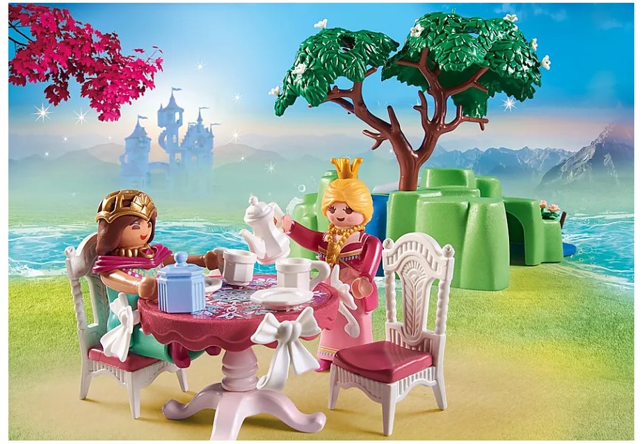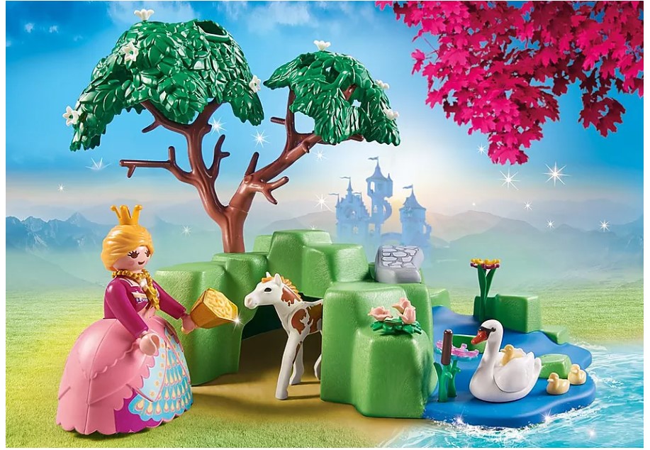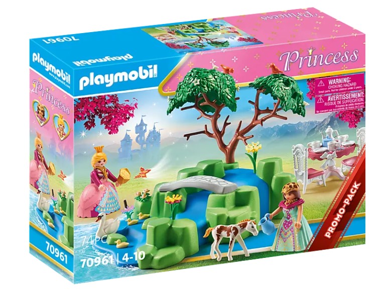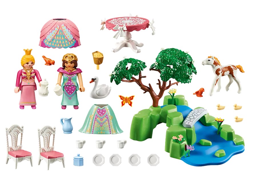 With the PLAYMOBIL Princesses' Picnic Promo Pack, you're off on a fairytale play adventure. Together with their cute foal, the two princesses enjoy a wonderful day at the pond. After a long walk, the friends enjoy their tea and watch the beautiful swan circling on the water. Enchanting fun for fairy tale fans aged 4 and up. Product details: The toy set includes two PLAYMOBIL figures, a pond with bridge, a foal, a swan, two chairs, a table and many other charming extras for imaginative role play in the children's room. The skirts, crown and hairnet are removable. The figures can, without skirts, sit on the chairs and take cup and jug in hand. The Princesses Promo Pack can be played with on its own or combined with other playsets from the PLAYMOBIL Princess series.