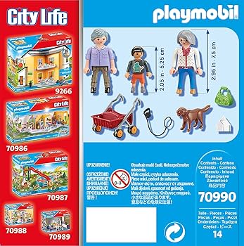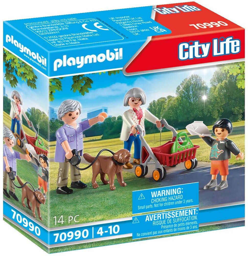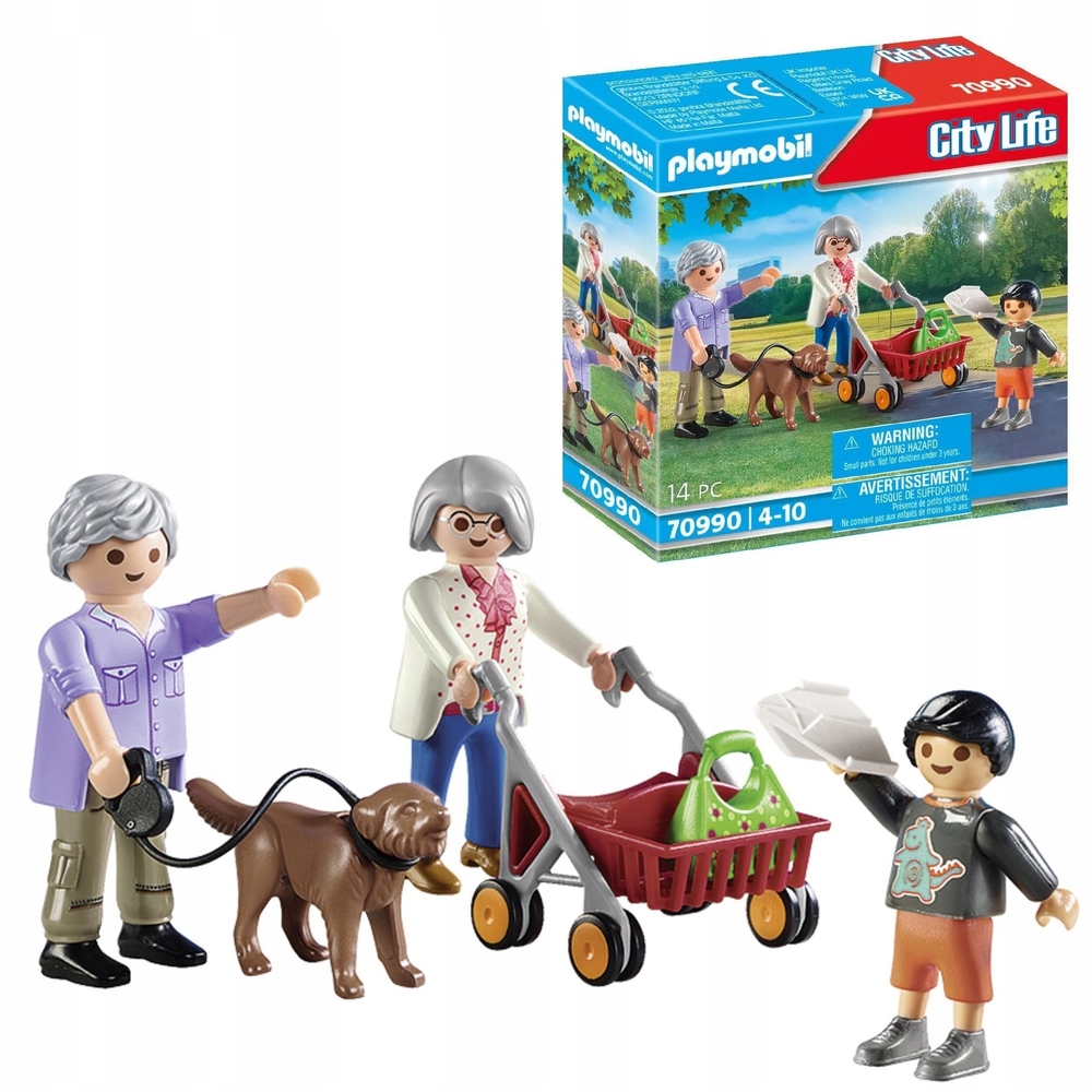 The grandparents love to go for walks. Every day they are outside and enjoy the time in the fresh air. Today their grandson is visiting and is already looking forward to the walk through the park, because he really wants to test his new paper aeroplane. He quickly runs in front and does his first throwing exercises. With her walker, Grandma prefers to take it easy. The set includes two grandparents and a child figure, a dog, a paper aeroplane, a walker and other extras.