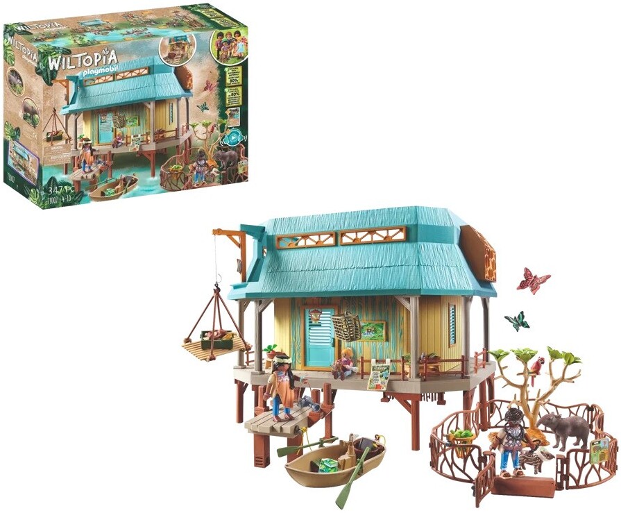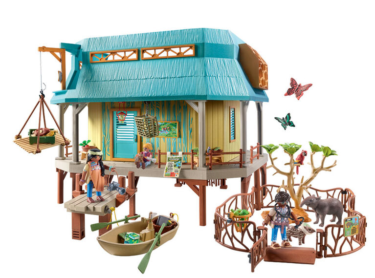 The Animal Care Station is located along the river. Here the native animals are cared for and reared. To access the station either the staircase or, on the river side, a footbridge can be used. The station is well equipped with treatment room with table, movable operating lamp, scales, heat lamp and illuminated monitor for viewing x-rays. A ladder leads to the station's top floor. Food is stored there and equipment for insect research is available. After successful treatment, the animals can use the two outdoor enclosures for recreation. Currently, a tapir and an ocelot family are housed there. As soon as the animals are healthy again, they will be released into the wild. This richly detailed playset transports children to the fascinating world of the Amazon. The playset contains three PLAYMOBIL figures, Sofia and Liv Palmer, as well as station manager Dr. da Silva, a fully equipped Animal Care Station with dock and outdoor enclosures, a rowboat, a tapir family, an ocelot family, two butterflies, a parrot and lots of other accessories for exciting wilderness adventures.