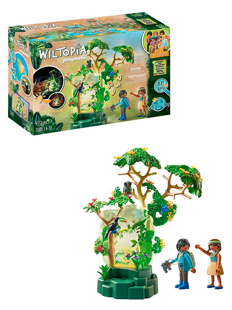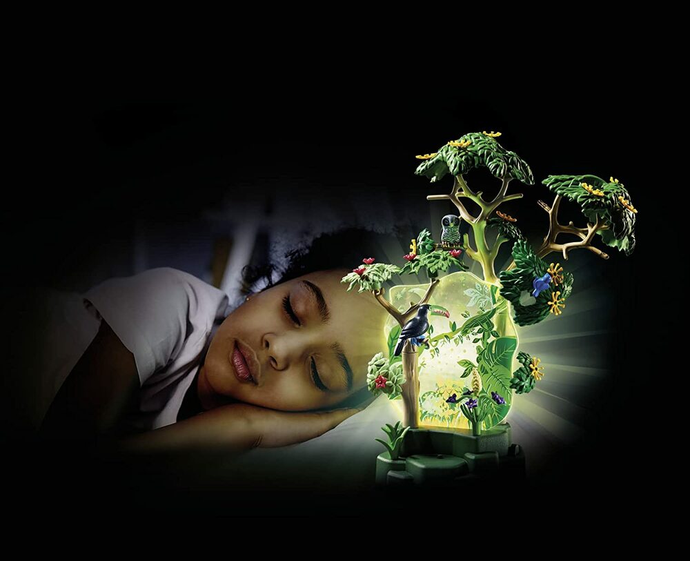 The night light is symbolic of the beauty and diversity of the Amazon rainforest and is intended to give real children a comfortable night's sleep. The night light is also the place where Rick and Alina sometimes meet to enjoy the silence of the evenings, good conversations and the rare internet reception. By inserting differently engraved discs, it is possible to switch between two motifs. Light, sound and volume can be adjusted via a controller and a button on the electronics module. The set contains two PLAYMOBIL figures Alina da Silva and Rick Palmer, a night light with rainforest sounds, two motif discs to change, a toucan, a tawny owl, an animal knowledge card toucan and other exciting extras.
