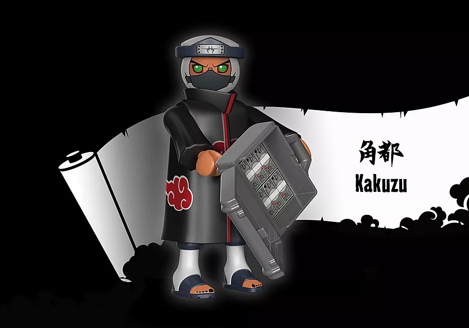 Kakuzu is a tall, muscular man with striking red eyes and green pupils. He is one of the oldest members of Akatsuki, where he mostly takes care of the finances. Kakuzu is very irritable and suspicious. Money means everything to him, so he is always willing to take detours to collect a bounty. The PLAYMOBIL playset shows Kakuzu in a typical black coat with red clouds and suitcase.