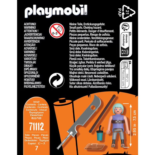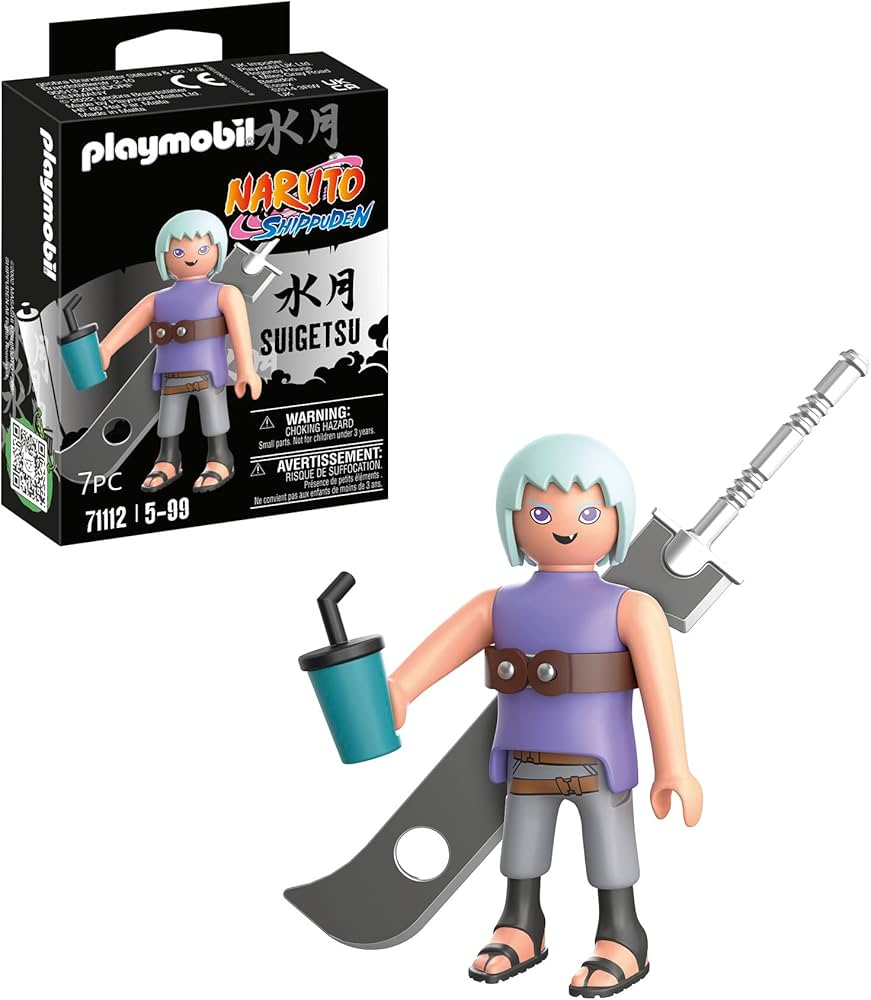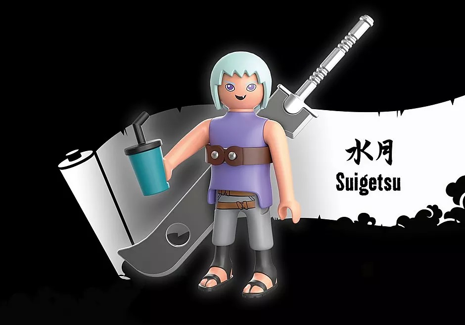 The PLAYMOBIL set features NARUTO SHIPPUDEN character Suigetsu in sleeveless purple shirt with gray pants and sandals. One of his fangs can be seen in the corner of his mouth. Around his chest he wears a thick brown belt with his sword attached.