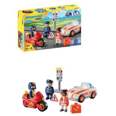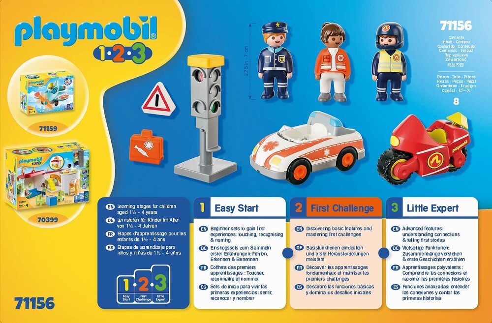 - The set contains three PLAYMOBIL 1.2.3 figures, 1 motorcycle, a doctor's vehicle, a traffic light, a warning triangle and many other extras. A slider on the side allows the traffic light to be set in three different positions.