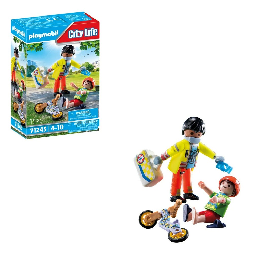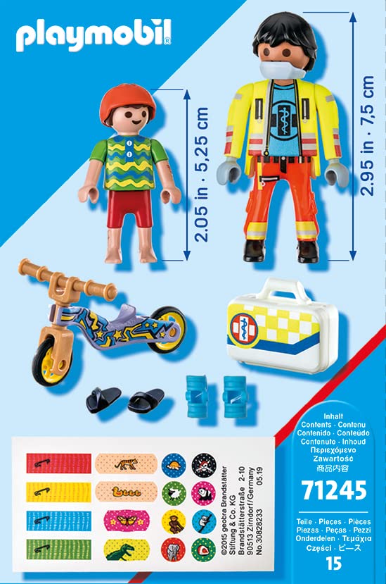 The toy set for children aged 4 and up includes two PLAYMOBIL figures, a scooter, a first-aid kit, bandage splints, helmet and other extras. With the included plaster labels wounds can be doctored.The PLAYMOBIL City Life series includes modern vehicles and realistic characters with which children can develop important skills and immerse themselves in exciting role play.