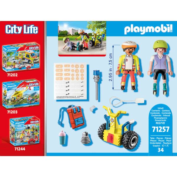 Rush to the rescue with the Balance Racer Starter Pack from PLAYMOBIL. An inline skater has fallen in the park and can no longer get up. Immediately the helpful paramedic comes to the rescue. Thanks to his agile balance racer, he is also fast on narrow paths. As soon as he reaches the injured person, he takes care of the first aid. Then it's off to the hospital for further examination. A great play experience for children aged 4 and up.