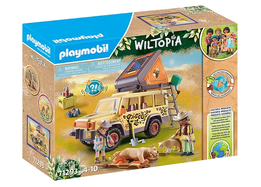 Get to know and love the world with the sustainable WILTOPIA playsets from PLAYMOBIL. With this solar-powered off-road vehicle, even missions in the savannah are no problem for veterinarian Jamie Palmer! He quickly helps the injured lion- by gently rubbing, the predator's injury disappears! The off-road vehicle has a new, removable roof attachment with a tent with enough space for two figures to spend the night.