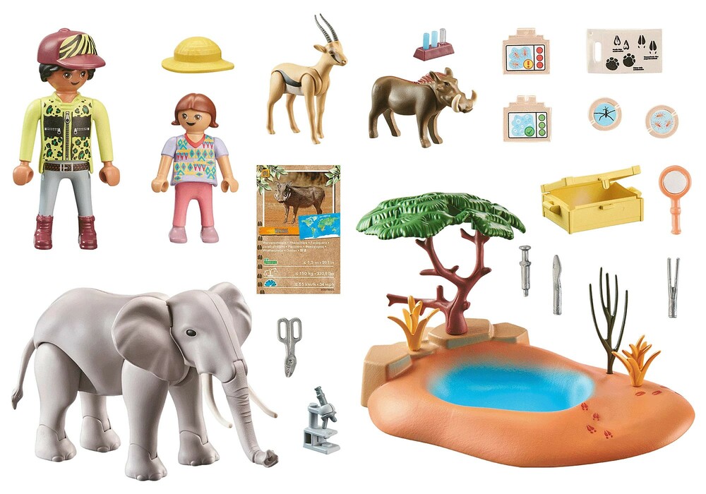 Know it, love it, protect it! Discover WILTOPIA, PLAYMOBIL's first eco-friendly product line made from an average of over 80% sustainable materials. The latest adventure takes explorer family Palmer to the African Serengeti. There they study the animal and plant world and learn many new things about our fascinating planet. At the waterhole in the savannah, the large, newly designed African elephant quenches his thirst alongside the warthog and the gazelle. With his trunk, he can take in water and also splash it out again. With the enclosed "test strips", children can do their own research and "test" the water quality.