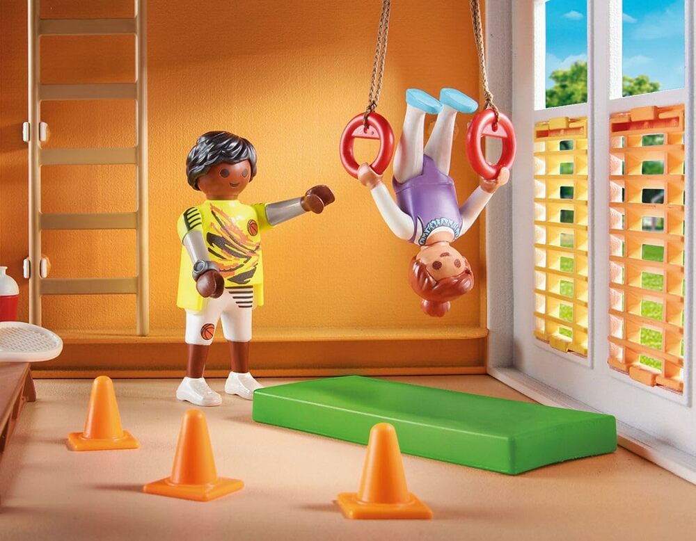 - The set consists of a gym extension, three PLAYMOBIL figures, a basketball hoop with basketball, gymnastic bars, soccer goal and soccer ball, tennis rackets and other great extras for sporty fun.