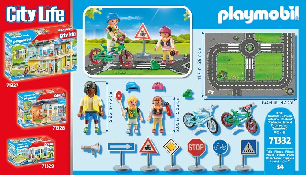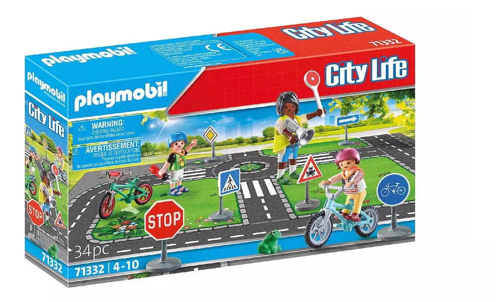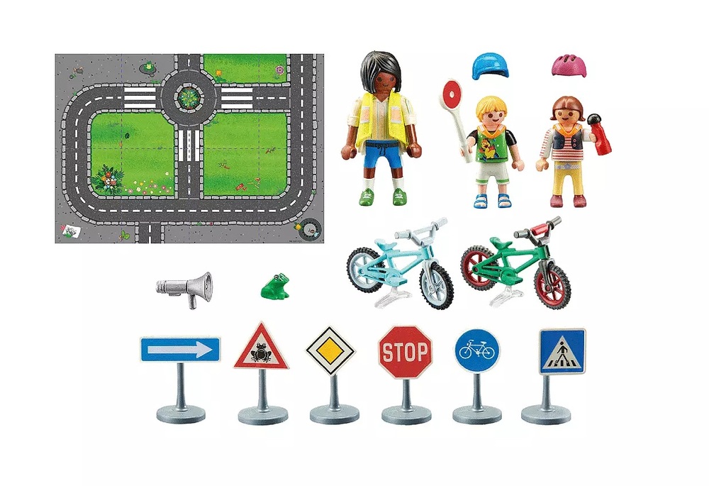 - The toy set includes three PLAYMOBIL figures, six traffic signs, two bicycles, a megaphone, a trowel and other great extras.