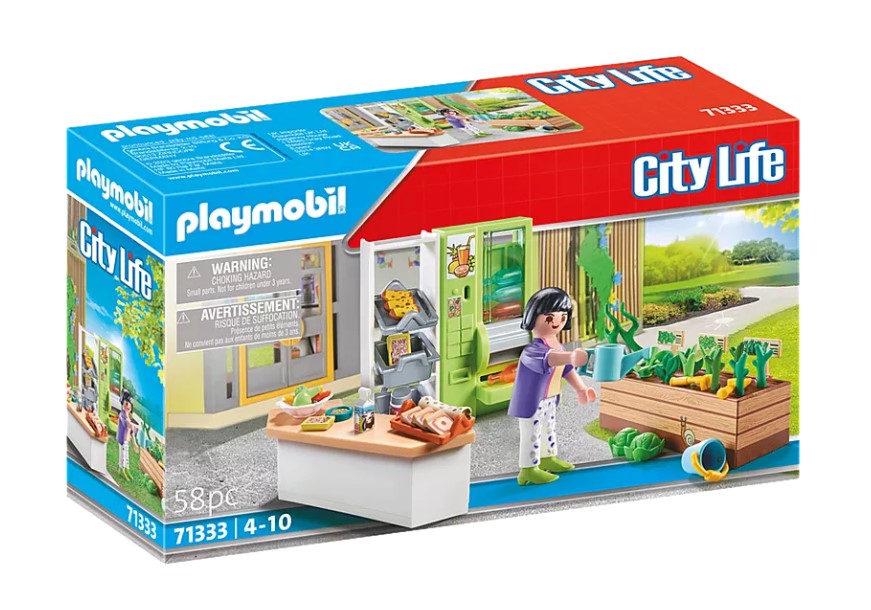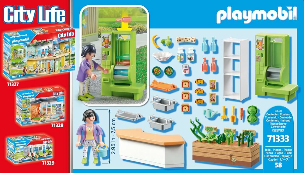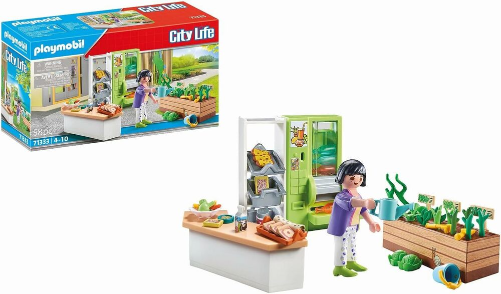 As soon as the school bell sounds, everyone rushes to the Lunch Kiosk. What delicious food from the school garden will be available today? Get your drinks at the fillable bottle vending machine. With the PLAYMOBIL set School Kiosk, children aged 4 years and up can recreate exciting adventures and everyday situations.