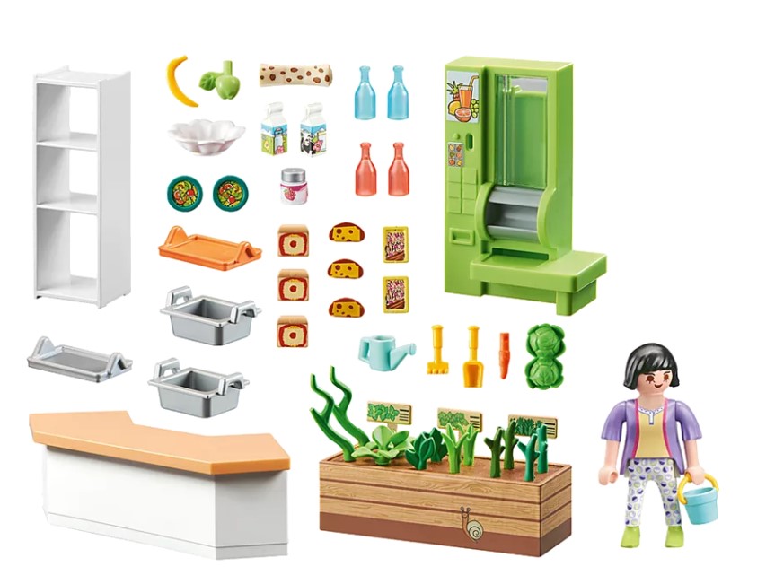 PLAYMOBIL Lunch Kiosk with a PLAYMOBIL figure, counter, fruit, snacks and fillable bottle machine.