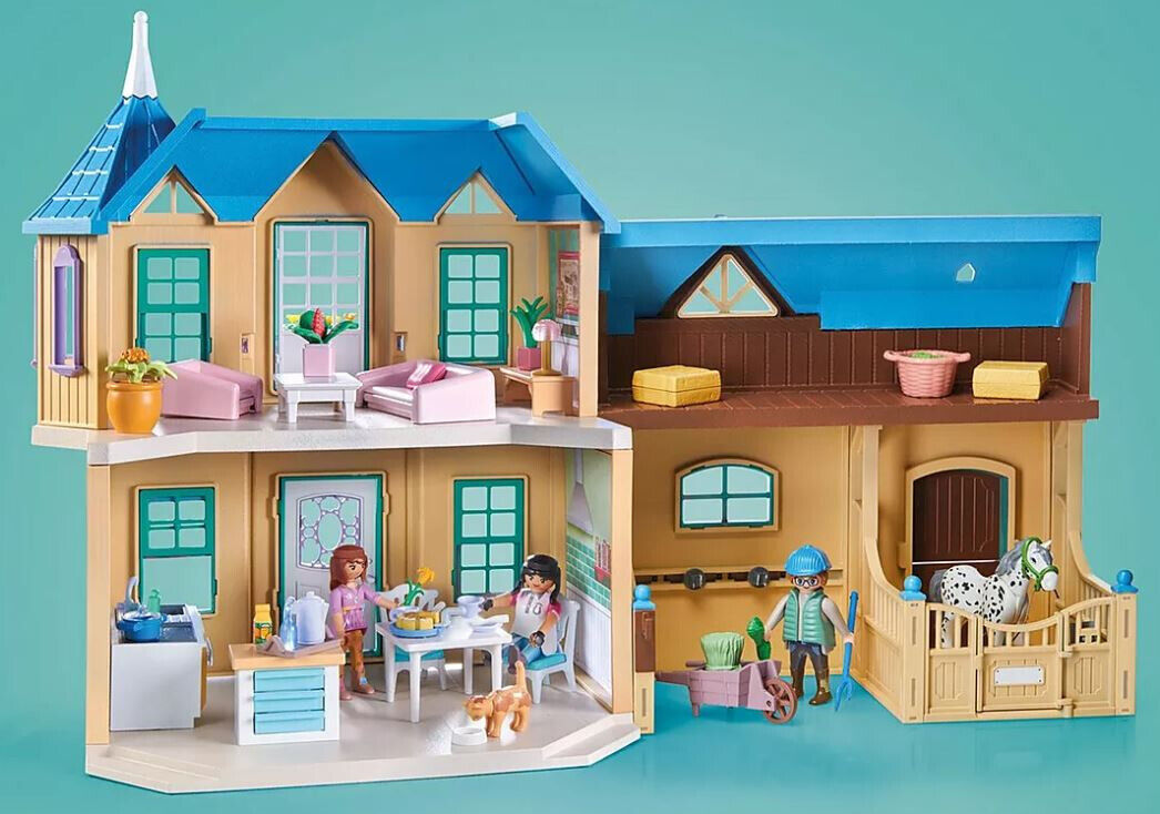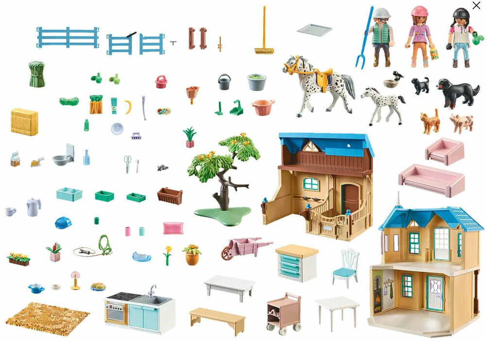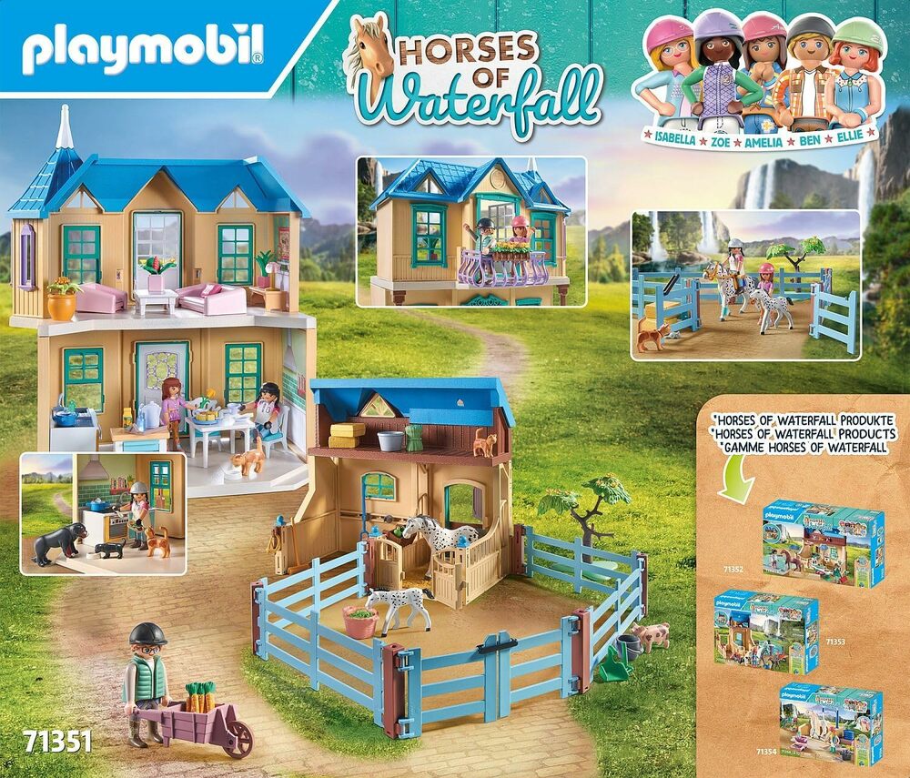 Come along to the Waterfall Ranch in the White Mountains and experience exciting adventures together with the five best friends Amelia, Isabella, Zoe, Ellie, Ben and their horses. The picturesque ranch with stable and paddock is the heart of the play world and invites to fantastic role-playing fun. The large stable with storage space for the horses' accessories is shared by the Knabstrupper mare Sparkles, her foal Domino and other domestic and farm animals. Horse fans and animal lovers will be thrilled with this PLAYMOBIL set!