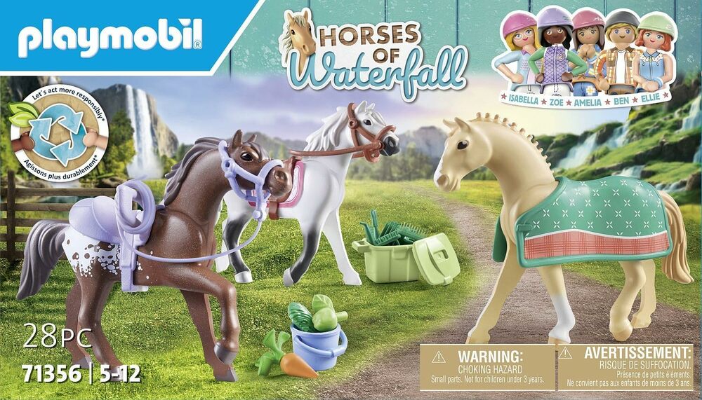 The large Waterfall Ranch has room for many more guest horses both in the barn and in the paddock! A Morgan, a Quarter Horse and a Shagya Arabian are just waiting to experience exciting riding adventures with the horse friends of Waterfall. The playset includes three horses with different riding accessories.