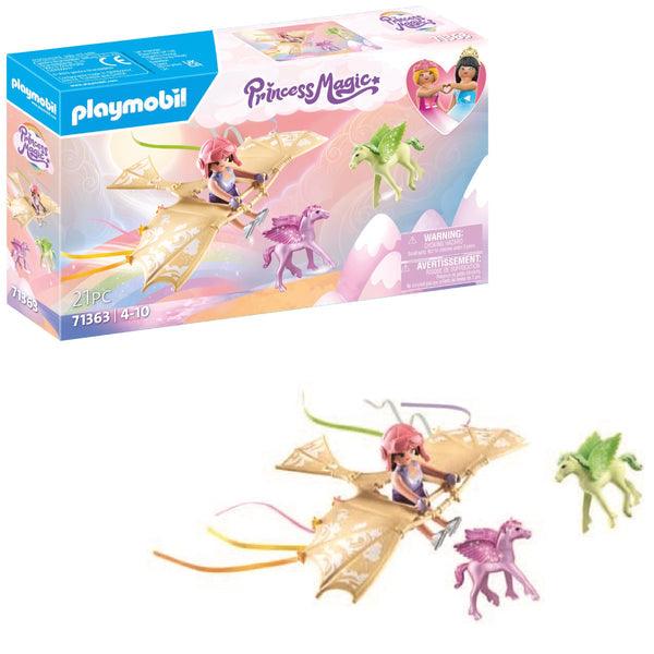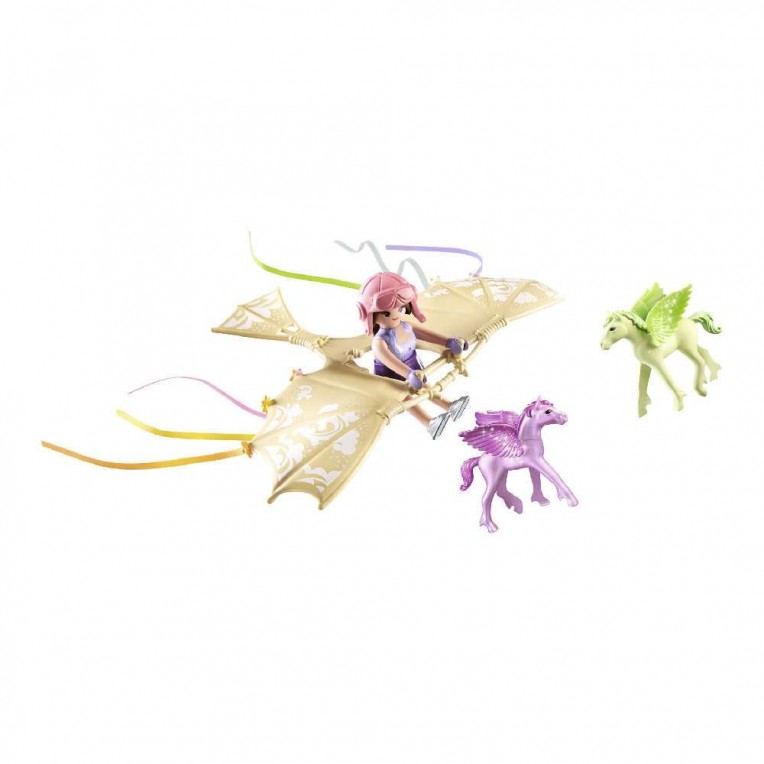 Make heavenly trips to the rainbow with the cute Pegasus Foals in the Clouds from PLAYMOBIL. The rainbow princess and her Pegasus foals are inseparable and love to fly through the air together. Thanks to her agile cloud plane, the princess can accompany her darlings at all times. Side by side, the trio whizzes through the clouds. Enchanting characters, magical creatures and fabulous buildings whisk children away on a fabulous play adventure.