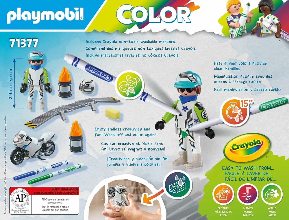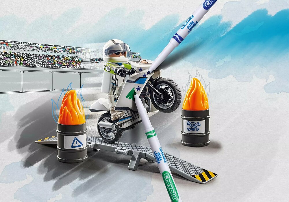 - Bring color into play with PLAYMOBIL Color! Design your stunt motorcycle with the included pens according to your ideas. The white basic figure leaves maximum scope for all creative ideas. The paint washes off easily - for never-ending fun.