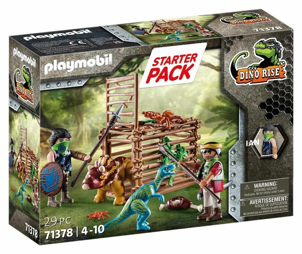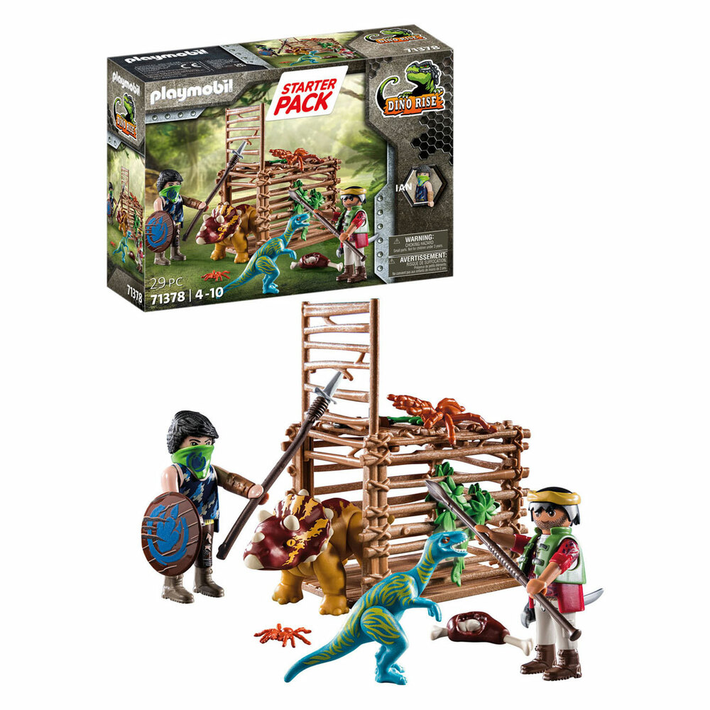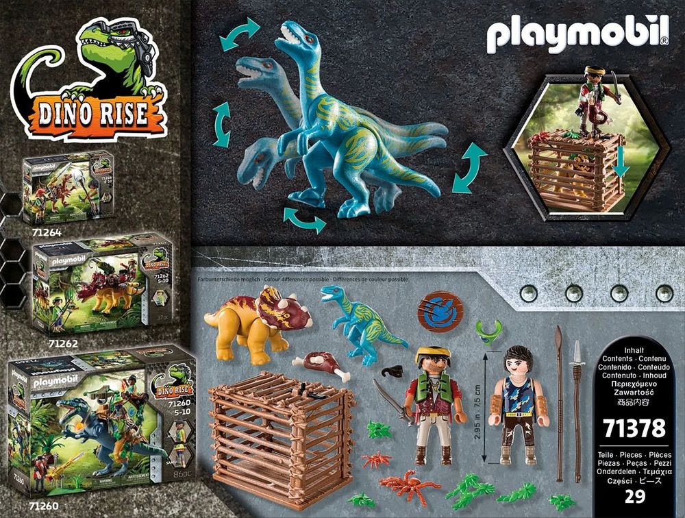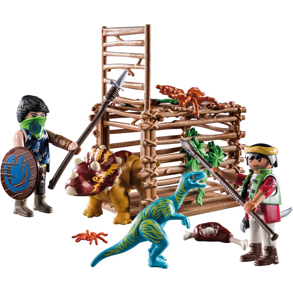 The dinos are loose at PLAYMOBIL Dino Rise! Together with their dinosaurs, Team Dino Rise meets every challenge. Teaming up with their Velociraptor, Ian and Milow try to rescue the Triceratops baby from it's predicament. With concentrated dino-human power, they will surely succeed. Both dinosaurs can be locked in the trap by moving the latch. With original characters, impressive dinosaurs and modern armor, the Dino Rise play world from PLAYMOBIL provides plenty of material for action-packed play adventures in the children's room. An ideal gift or souvenir for dinosaur fans aged 4 and up.