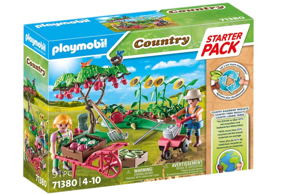 Take the watering can and help the farmers in the care of the vegetable garden. In addition to fresh fruit and vegetables, this garden also has gorgeous flowers in the raised bed and an apple tree. With a scythe, wheelbarrow and numerous garden accessories, everything is available to take care of the garden in the best possible way. The new large organic farm invites children to discover a new side of life and work on the land. Made on average from over 80% sustainable material, the new edition of the PLAYMOBIL classic is full of play ideas with a heart for the environment.