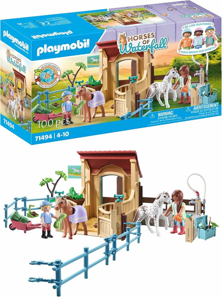 - Set includes a PLAYMOBIL stable with PLAYMOBIL figure, two ponies, a horse box with washing area, fence elements, and numerous extras for horse care.