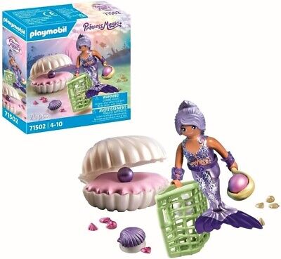 Embark on magical adventures with the adorable PLAYMOBIL set, Mermaid with Pearl Seashell. The mermaid eagerly searches the ocean floor for pearls and collects them with the pearl holder. Using the net, she transports the gathered pearls to the large shell and places them there. The lovingly crafted figures and animals of the Princess Magic Underwater World inspire children to embark on ever-new imaginative adventures.