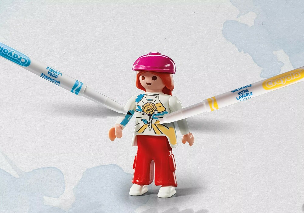 - Accessories: 1x ramp with platform section and wall element, 1x palm tree with base plate, 1x boom box, 1x crate, 5x paint spray cans, 1x skateboard, 2x drinks with straw, 4x thin Crayola pens, 1x sponge, 1x paintable and washable sticker sheet