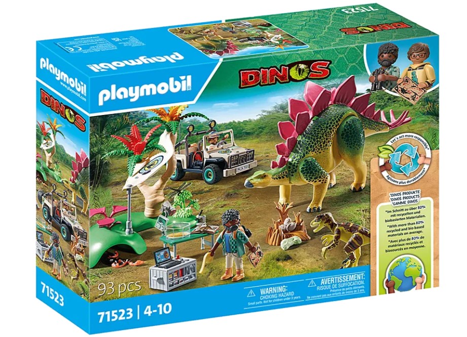 - Detailed dinosaur toy set with two PLAYMOBIL figures, a Stegosaurus, a Deinonychus, a snake, an off-road vehicle, dino eggs, a nest, walkie-talkies, and other exciting extras for big dino fun.
