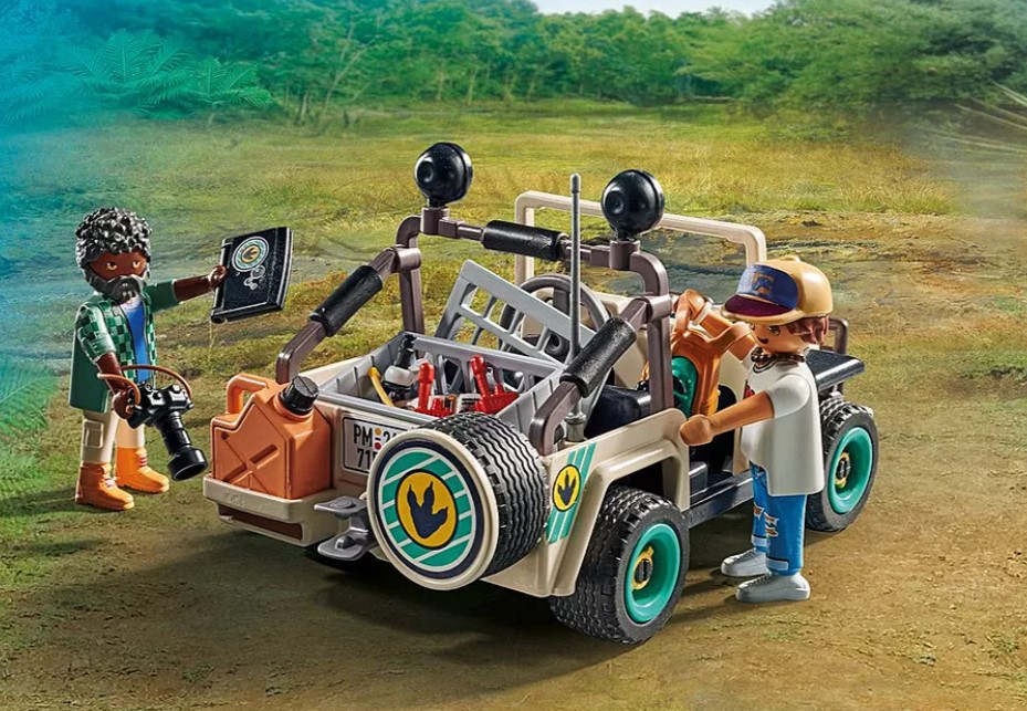 - Accessories: 2 radios, 1 camera, 1 laptop, 1 microscope, 1 table, 1 book, 1 tape measure, 1 backpack, 1 incubator, 3 dino eggs, 1 nest, 1 tuft of grass, 1 grassy hill with plants, 1 sail, 1 vehicle, 1 box, 1 petrol can, 1 map, 2 dino knowledge cards