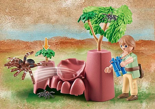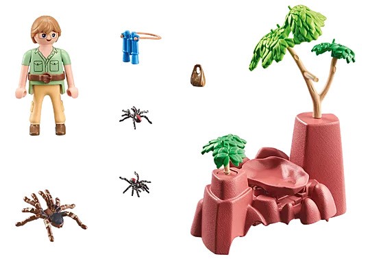 At the Spider Rock, Dr. Jamie Palmer observes Australia's native spiders from a distance and with binoculars. Be careful, as some of them can jump! By pressing the switch hidden under the small plant, the Sydney giant spider is catapulted upwards. With rock hiding place, giant spider and other spiders. The sustainable PLAYMOBL Wiltopia play world takes children to native and exotic regions of our earth and teaches them in a playful way about the beauty and fragility of our world and its ecosystem.