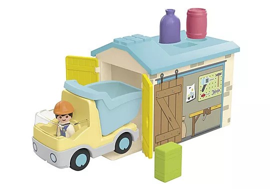 - Accessories: 1 Garage with sorting feature, 1 construction truck, 1 barrel, 1 box, 1 bag