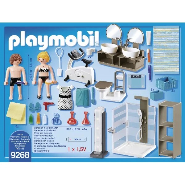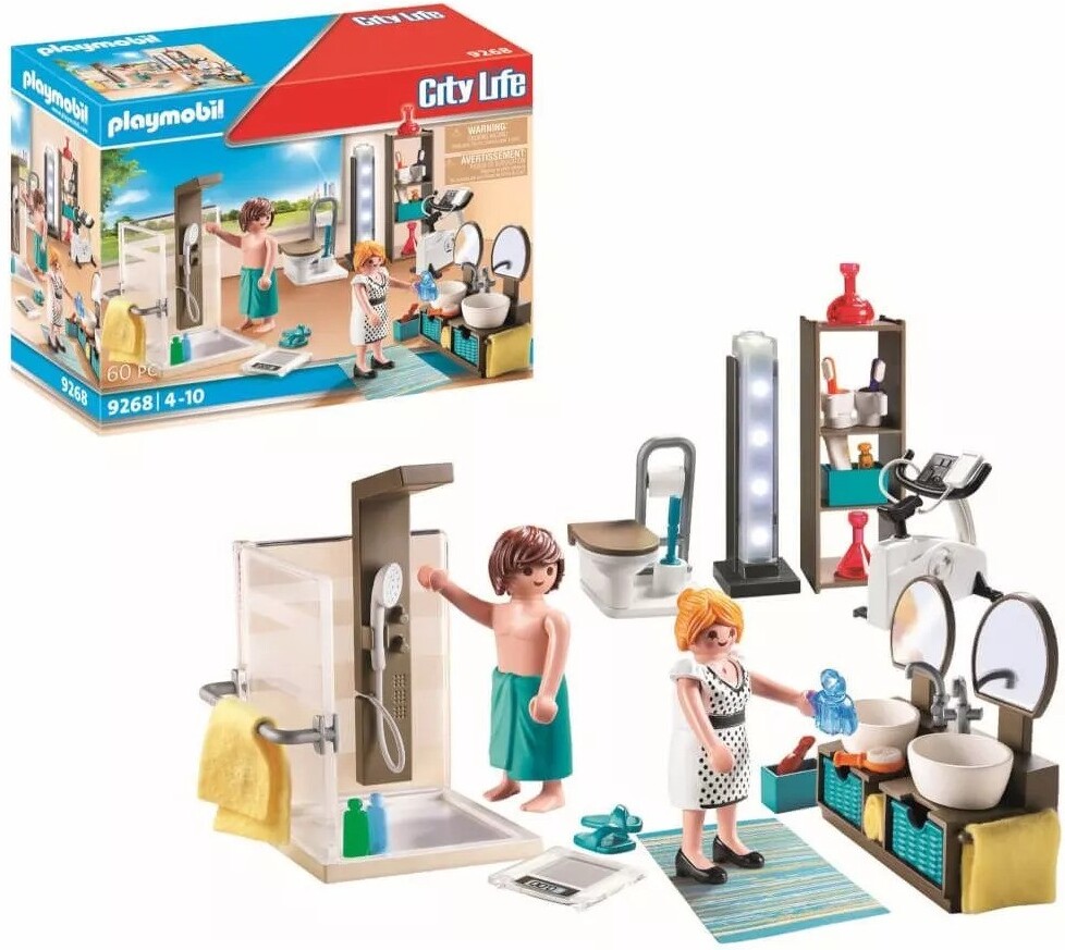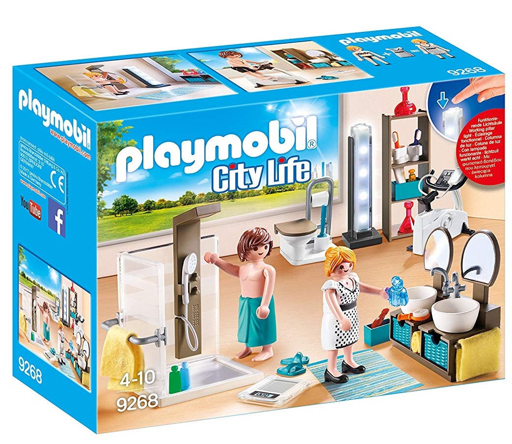 Freshen up for a big day in the bathroom. Start out by getting in a workout on the exercise bike before hitting the shower. There is plenty of room under the double sinks and on the shelving unit to store all your toiletries and cosmetics. The functioning column lite makes it easy to find your way around. Set includes two figures, exercise bike, toilet, two sinks, shower, weight scale, shelf unit, storage baskets, toothbrushes, toothpaste, hairdryer, comb, interchangeable dress, and lots of other accessories. Combine this set with the modern house (9266 – sold separately) for added fun.