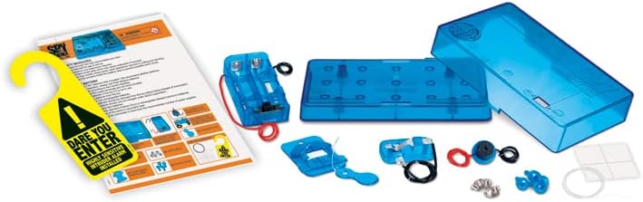 Learn the science of connecting an electric circuit. Construct your own door buzzer and place it behind your door. Stop intruders from your room. It's cool and fun! Contains plastic platform and alarm casing, 1 set of plastic accessories, metal pegs, electric buzzer, electric wire, string for alarm trigger, and detailed instructions.