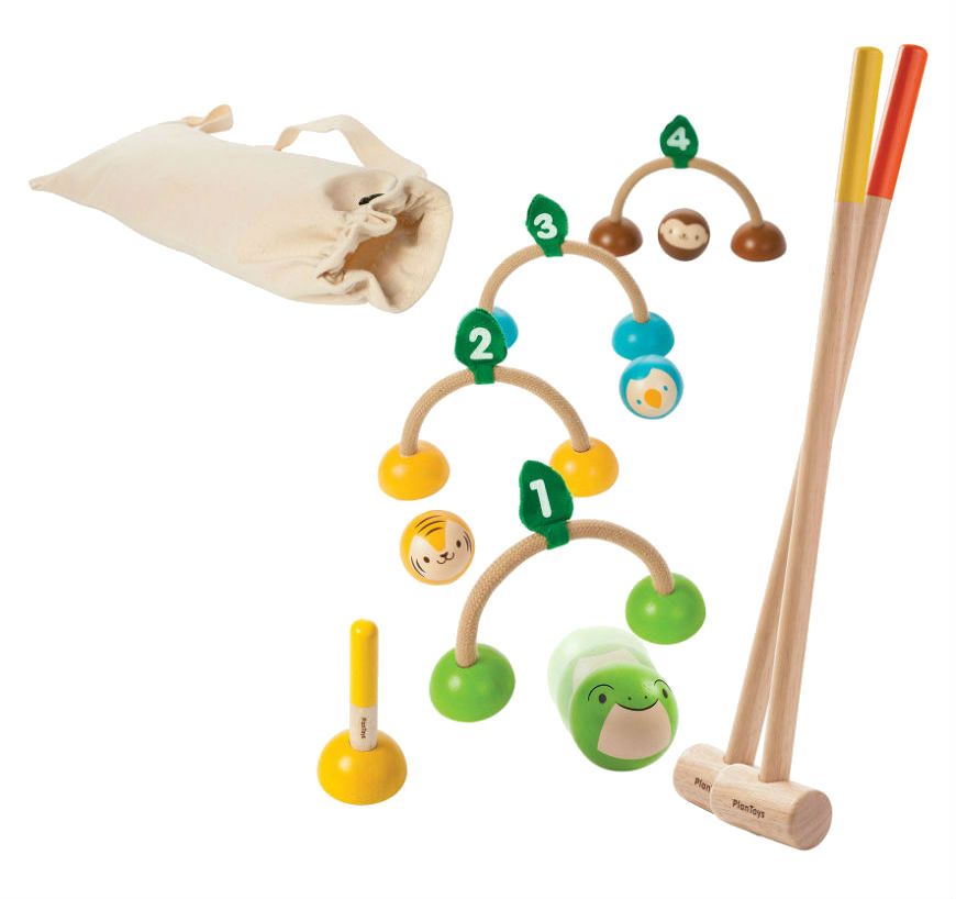 - 4 different animal wooden balls – bird, tiger, monkey and frog, 2 mallets, 4 wickets and a final stand