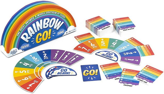 One right answer, a whole spectrum of clues! Each question has seven clues but only one right answer. The clues get easier, but the less you use, the more points you win! Any player can answer every question, so it’s a race to react and slap the “Go!” card first. How will you play? Go! for a high score, guess early, and risk crashing out of the round? Or Go! steady, use more clues, and cunningly capture points? It’s time to show your true colors! Ready? Steady? Rainbow GO!