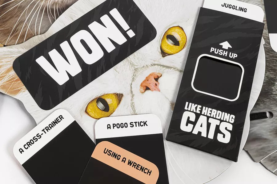 Each round the cats don cat mask blindfolds and act out one of 2 clues, but here’s the cat-ch, when acted out they may appear quite similar! The herders then group the cats and guess what they were acting. Work together to win as many cards as you can in 5 rounds. Unique and grammable cat mask blindfolds mean nervous actors can let loose their inner dicat-rio and mime like no-one’s watching!