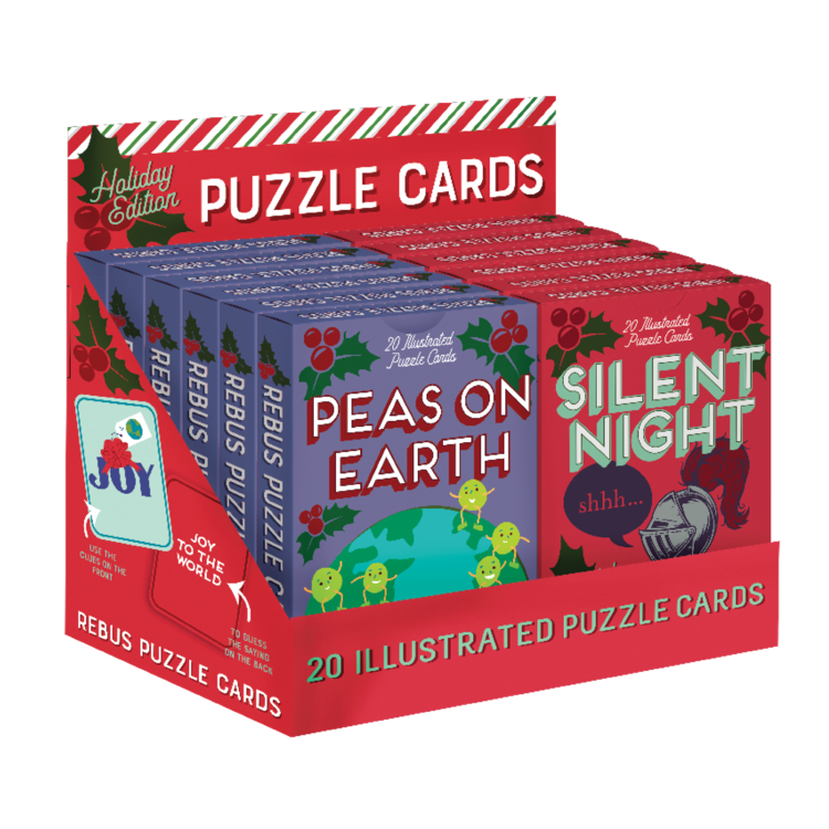 These festive decks of holiday puzzles includes 20 beautifully-illustrated cards. Each card shows a clue to a well-known carol or holiday phrase on one side, and the answer on the other.