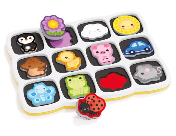 Smart Puzzle is a a double-sided magnetic puzzle for small children. One side features 12 cute images for the child to recognise and place in the correct spaces. The pieces are thick and soft and can be picked up easily, and they magically stick to the board thanks to magnets. The other side is a magnetic board where the magnetic figures can be placed anywhere on a colourful background, in order to create fantastic stories.