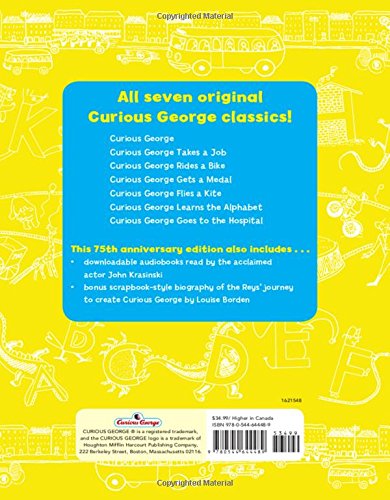Curious George has delighted millions of readers for seventy-five years. Now fans can have all seven of the original Curious George titles in one complete volume. Stories included in this collector’s edition are Curious George, Curious George Takes a Job, Curious George Rides a Bike, Curious George Gets a Medal, Curious George Flies a Kite, Curious George Learns the Alphabet, and Curious George Goes to the Hospital. This edition also includes an original illustrated map of Curious George’s world, as well as a new scrapbook biography of H. A. and Margret Rey’s creative journey written by the historian Louise Borden. Includes bonus downloadable audio read by the actor, producer, and director John Krasinski. Access code can be found inside the book on page 2.