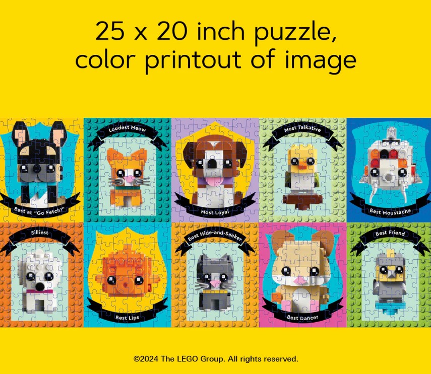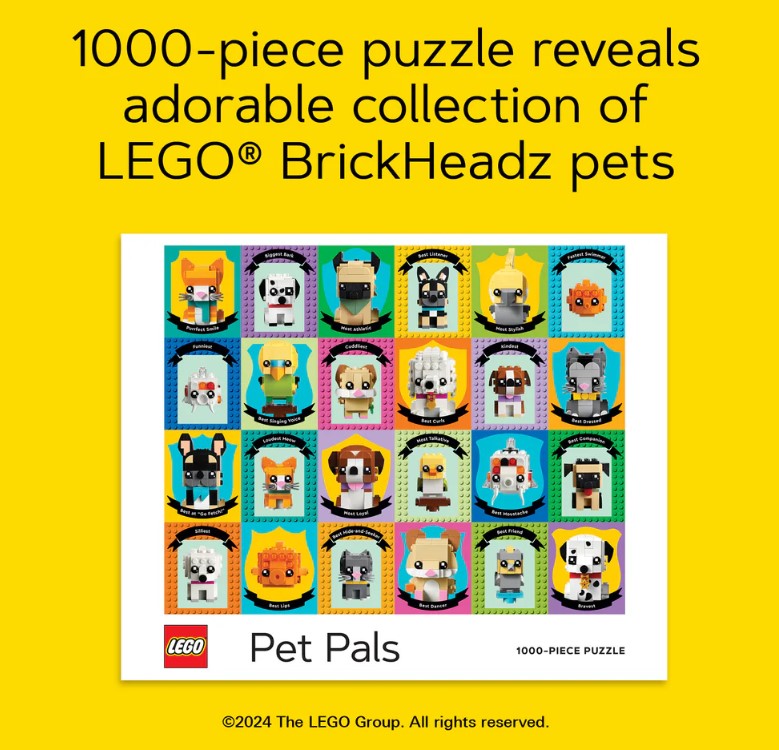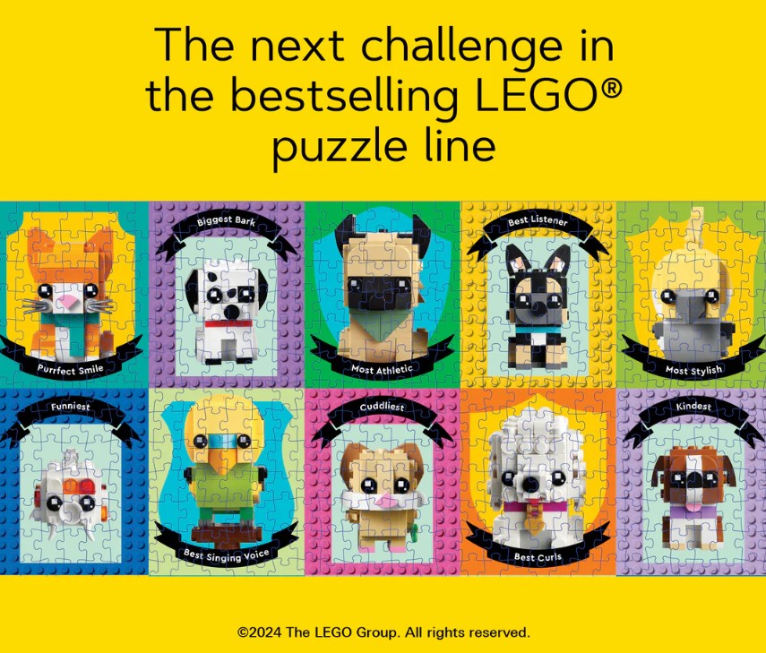 LEGO, the LEGO logo, and the Brick and Knob configurations are trademarks of the LEGO Group. ©2024 The LEGO Group. All rights reserved. ANIMALS FOR ALL: Whether you’re a puppy parent or a cat person, have a hamster home or bird sanctuary, there is a LEGO pet for everyone on this puzzle. These adorable cats and kittens, dogs and puppies (and more!) will delight animal lovers everywhere.