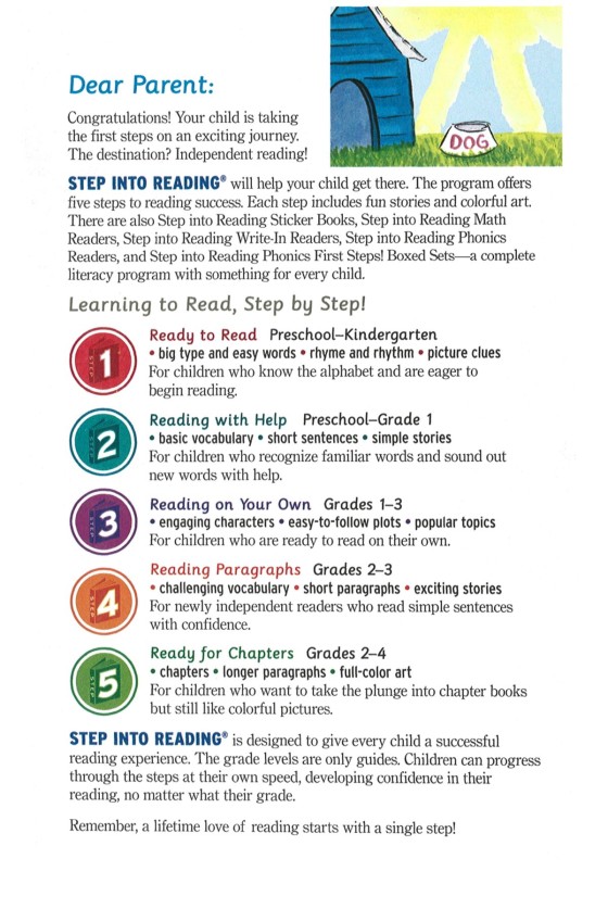 Step 2 Readers use basic vocabulary and short sentences to tell simple stories, for children who recognize familiar words and can sound out new words with help. Rhyme and rhythmic text paired with picture clues help children decode the story.
