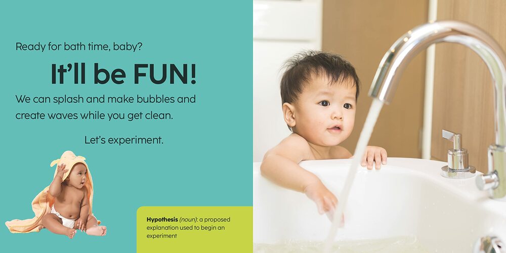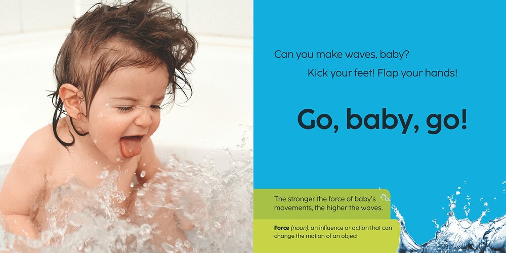 Even Einstein started somewhere, so who’s to say your little genius-to-be won’t find inspiration in the bath? Gather up your gear: floating toys, fluffy towels, warm tub, favorite little lab partner (may take multiple attempts). Place tiny tot in the tub (note water displacement), and proceed to explore buoyancy, gravity, and evaporation. Now it’s time to make waves and see that third law of motion in action. Go, baby, go! Wait, hold on . . . Stop, baby, stop! In a bright, graphic board book leavened with dry humor, photos of happy tykes and a tongue-in-cheek running dialogue are sprinkled with factual asides that define basic concepts of physics. So don your protective goggles—with a bathtub as a lab bench, your precocious little one can master physics every day!