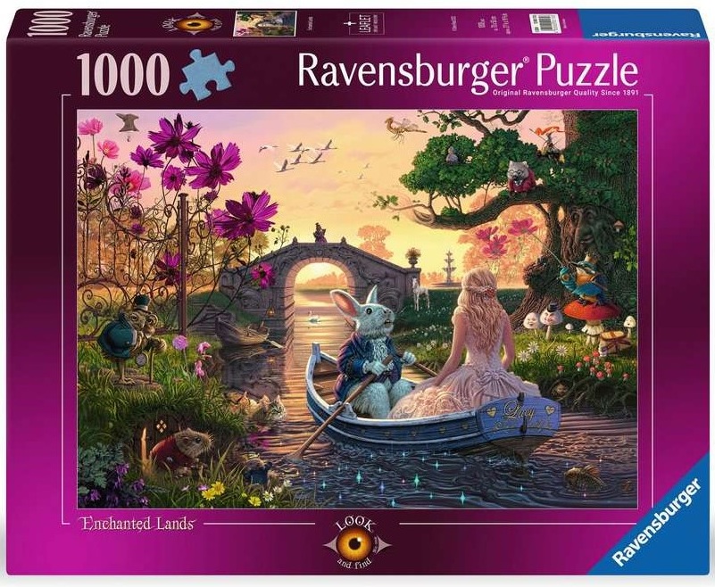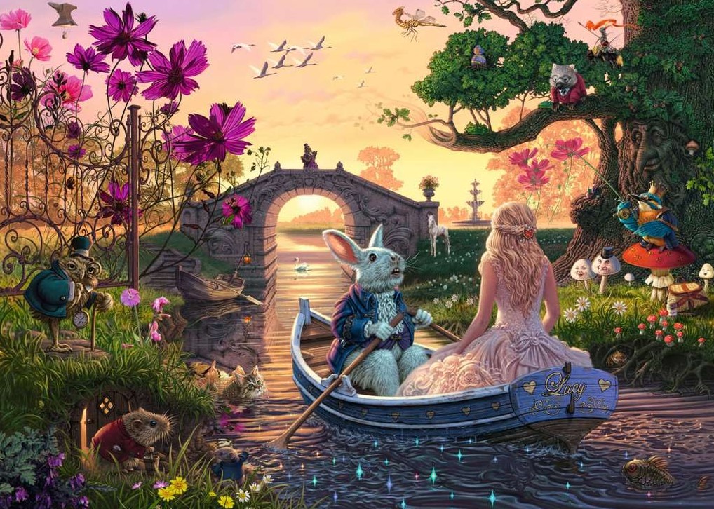 Take a boat ride down a sparkling stream in the land of milk and bunnies! The white rabbit carefully rows lovely Lucy to her destination, while a catfish, critters and happy daisies look on. Artemis Owl wisely keeps track of the time as His Royal Highness Kingfisher dips his line, looking for a bite. Artist Steve Read has cleverly hidden 16 rabbits in his design — can you find them all? A lavishly-illustrated puzzle inspired by famous literary works,